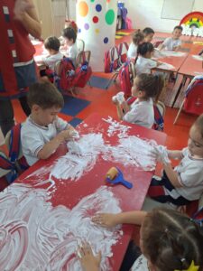 Con témperas, espuma, hojas secas, objetos tridimensionales o collages, los niños crean mientras aprenden, se expresan mientras construyen vínculos y desarrollan su autonomía desde lo cotidiano.